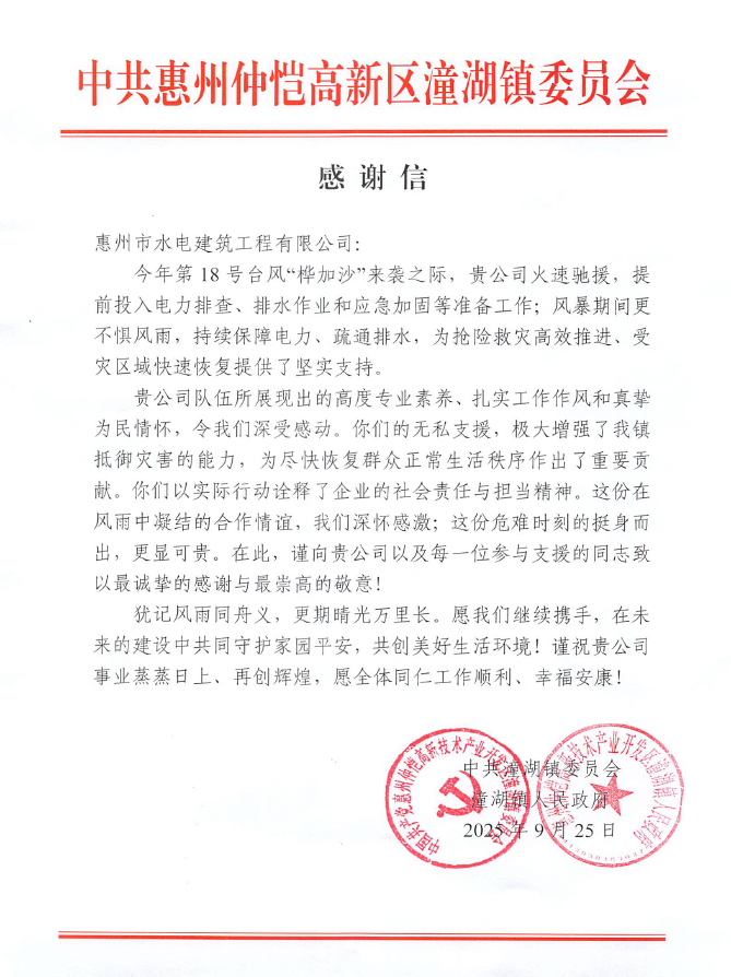 9月26日,仲愷高新區潼湖鎮政府向水電公司發來感謝信,來信指出,水電公司在第18號臺風“樺加沙”來襲之際,火速馳援,提前投入電力排查、排水作業和應急加固等準備工作;風暴期間更不懼風雨,持續保障電力、疏通排水,為搶險救災高效推進、受災區域快速恢復提供了堅實支持,體現了高度專業素養、扎實工作作風和真摯為民情懷。