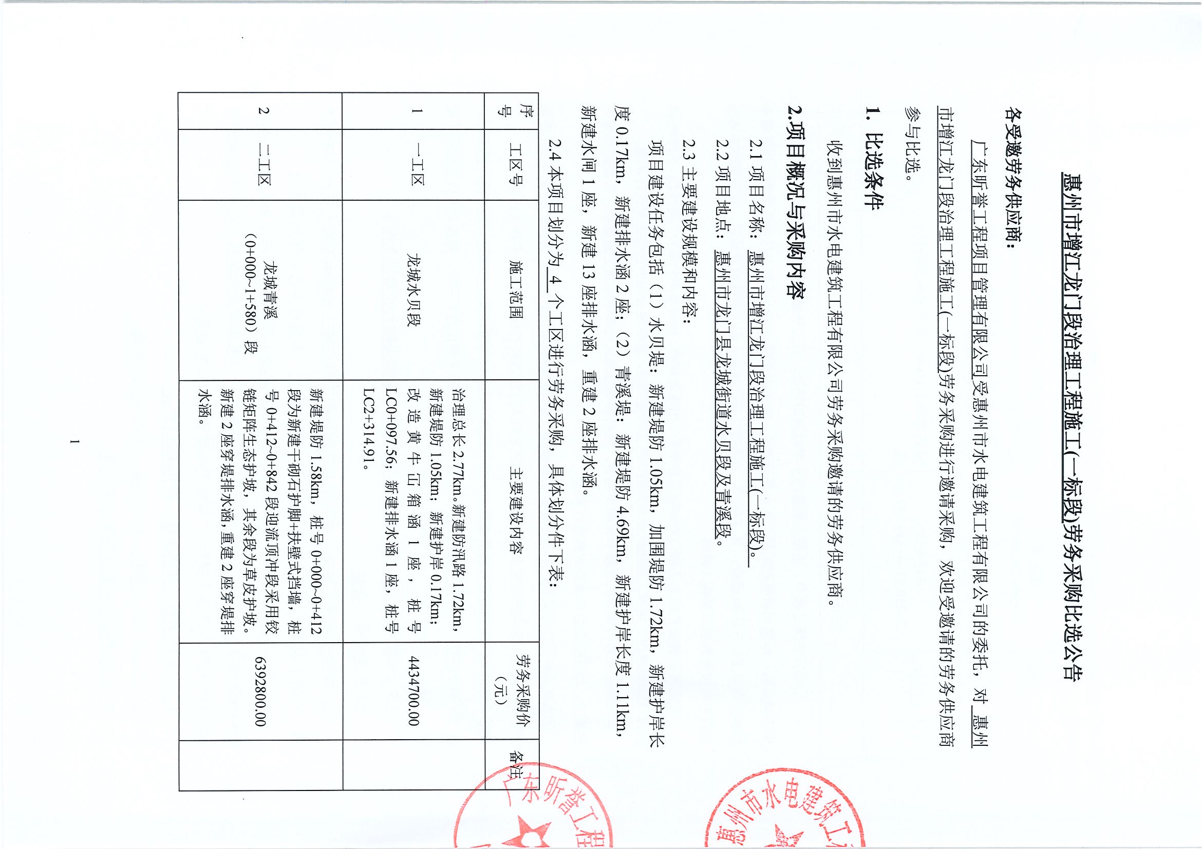 惠州市增江龍門段治理工程施工(一標(biāo)段)勞務(wù)采購比選公告