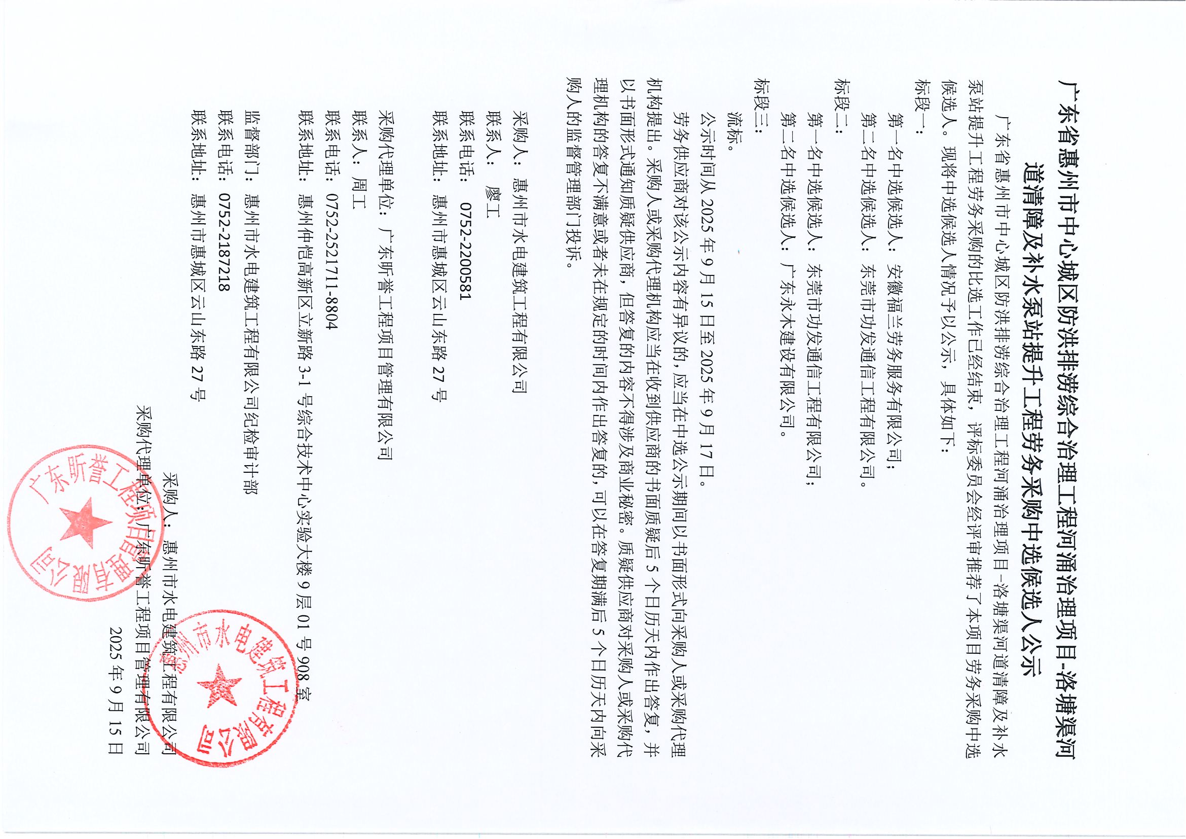 廣東省惠州市中心城區防洪排澇綜合治理工程河涌治理項目-洛塘渠河道清障及補水泵站提升工程勞務采購中選候選人公示