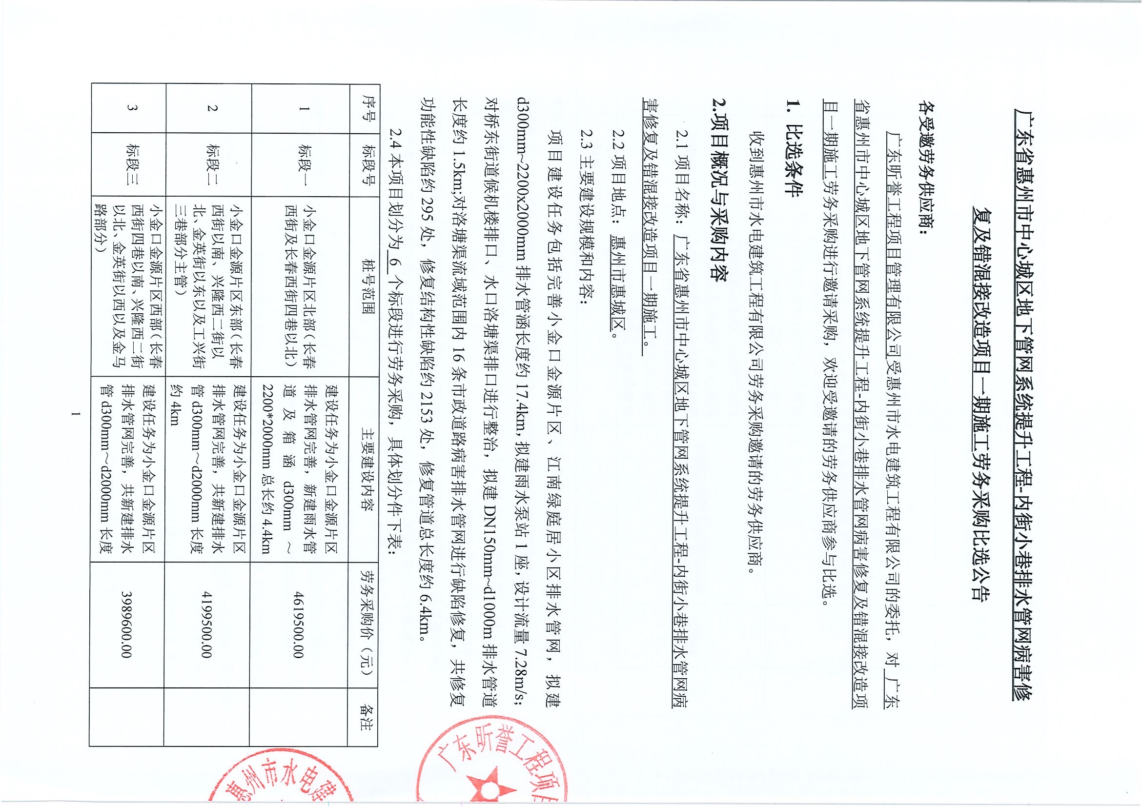 廣東省惠州市中心城區地下管網系統提升工程-內街小巷排水管網病害修復及錯混接改造項目一期施工勞務采購比選公告