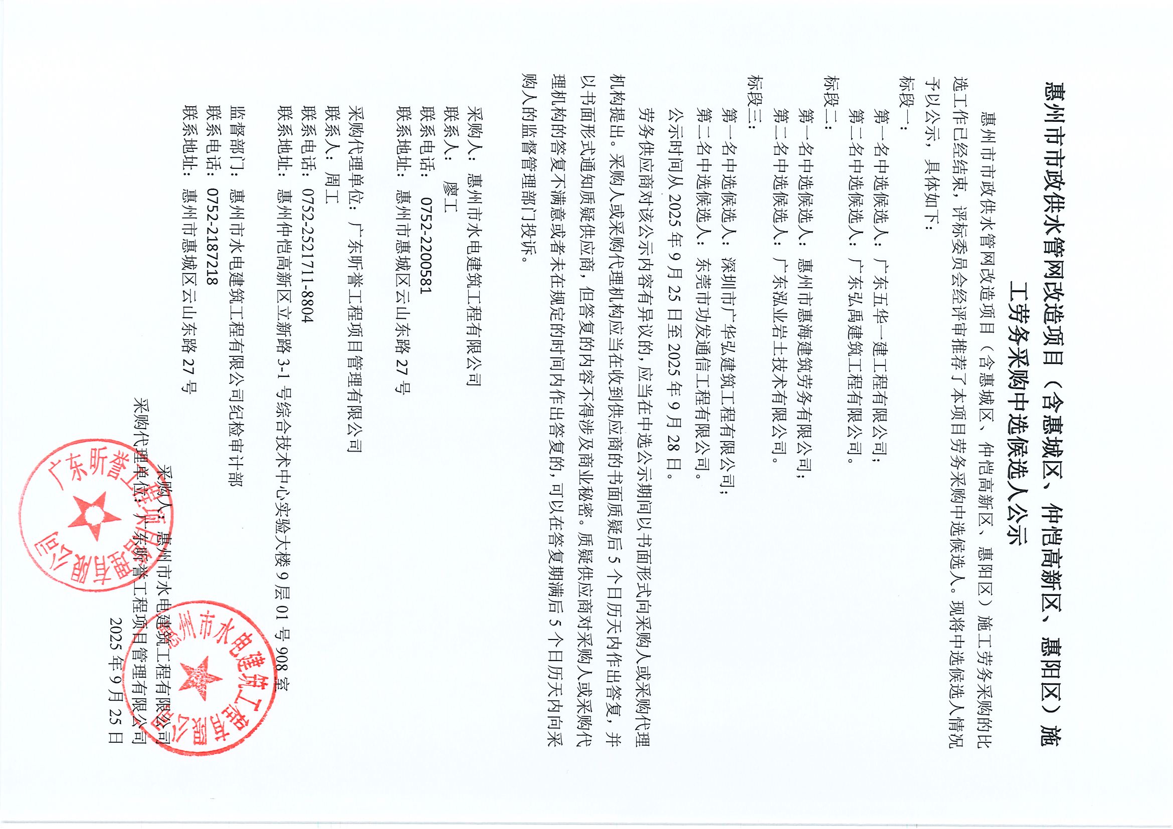惠州市市政供水管網改造項目(含惠城區、仲愷高新區、惠陽區)施工勞務采購中選候選人公示