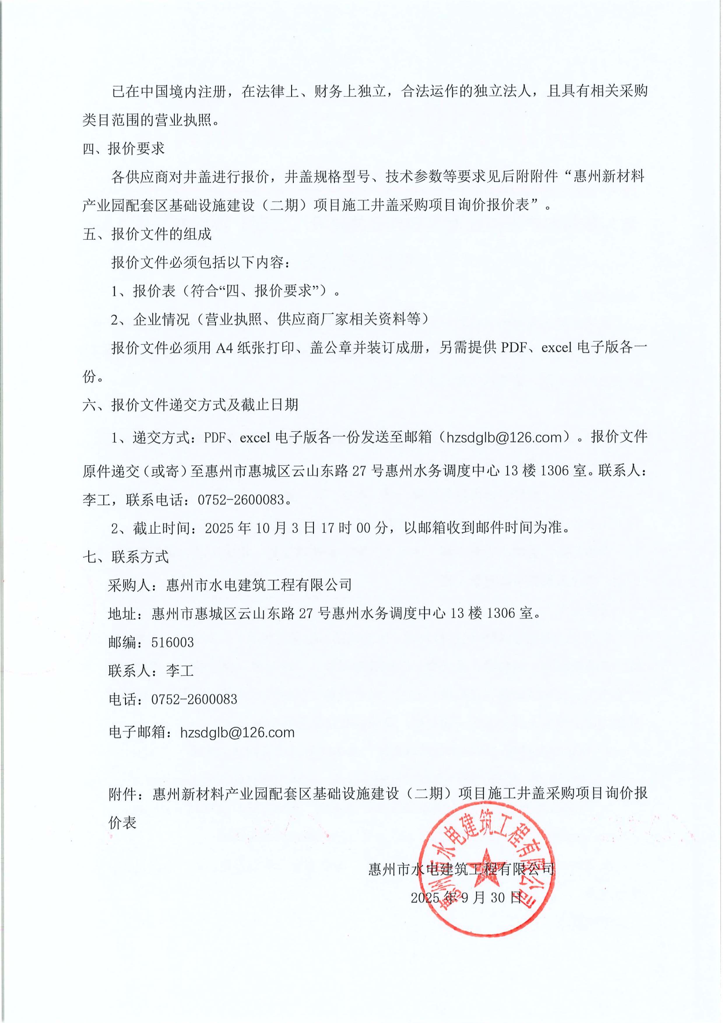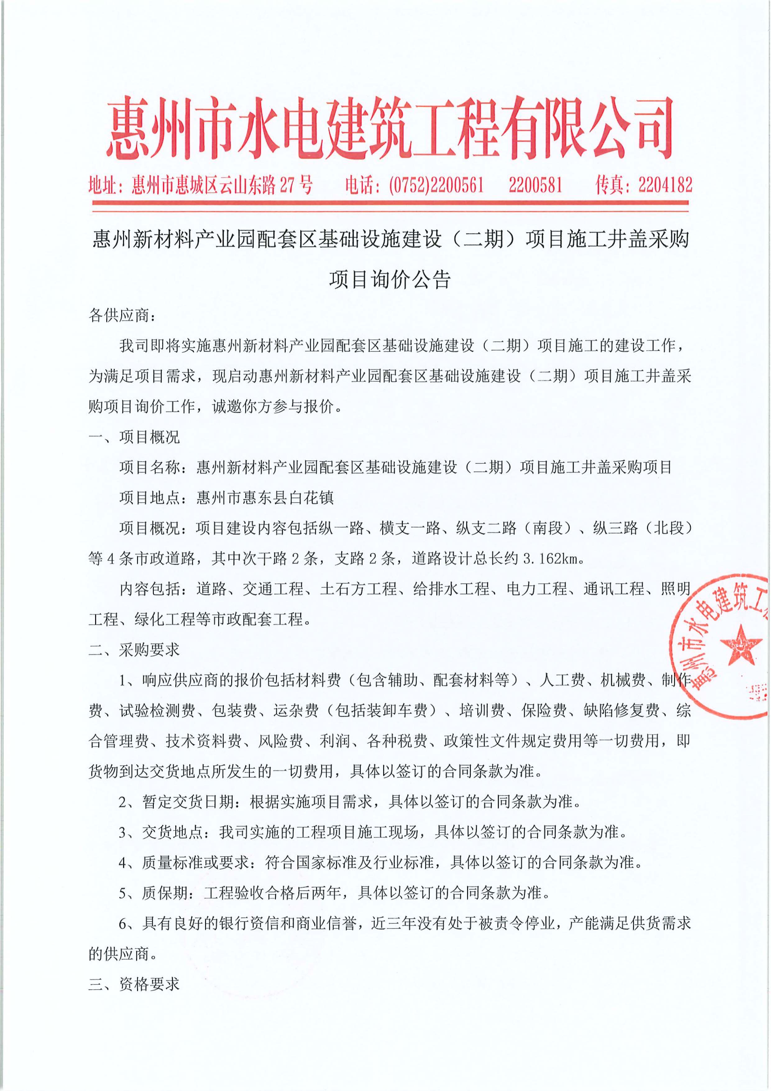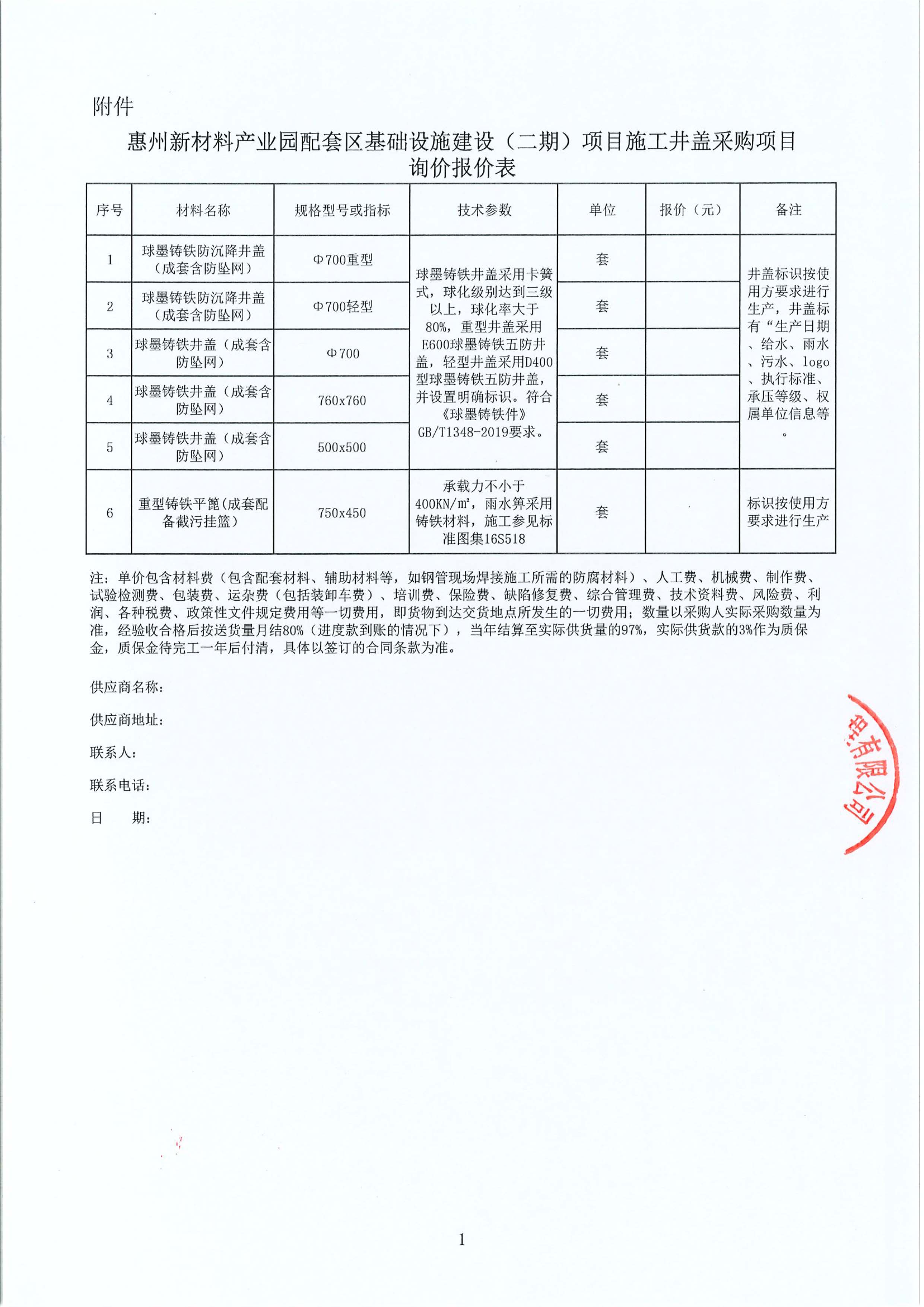惠州新材料產業園配套區基礎設施建設(二期)項目施工井蓋采購項目詢價公告附件: