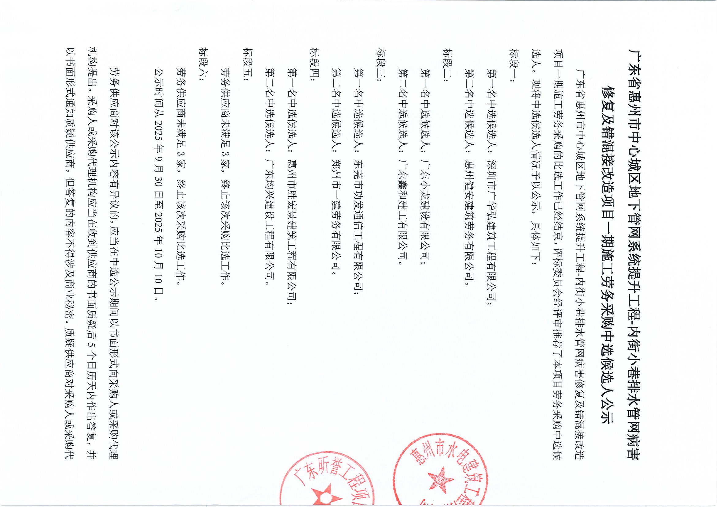 廣東省惠州市中心城區地下管網系統提升工程-內街小巷排水管網病害修復及錯混接改造項目一期施工勞務采購中選候選人公示